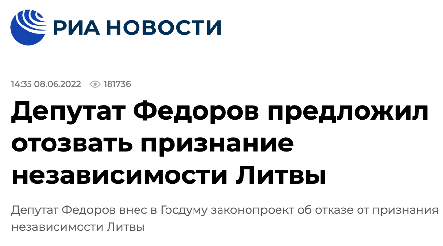 除此之外,“俄罗斯称考虑撤销1991年苏联解体时对立陶宛和乌克兰独立的承认”一说确实部分有据可循,不过俄此举却并非对基辅市议会这道并不存在的法令的回应。据俄新社6月8日报道,俄议员叶甫根尼·费奥多罗夫(Yevgeny Fyodorov)向国家杜马提交了一份关于废除苏联“承认立陶宛共和国独立”决议的立法草案。费奥多罗夫宣称,承认立陶宛独立的决议没有经过全民公投,违反了苏联宪法,因此应当被取缔。但值得注意的是,暂无证据表明俄杜马正在重新考虑撤销1991年乌克兰从苏联独立的决议。