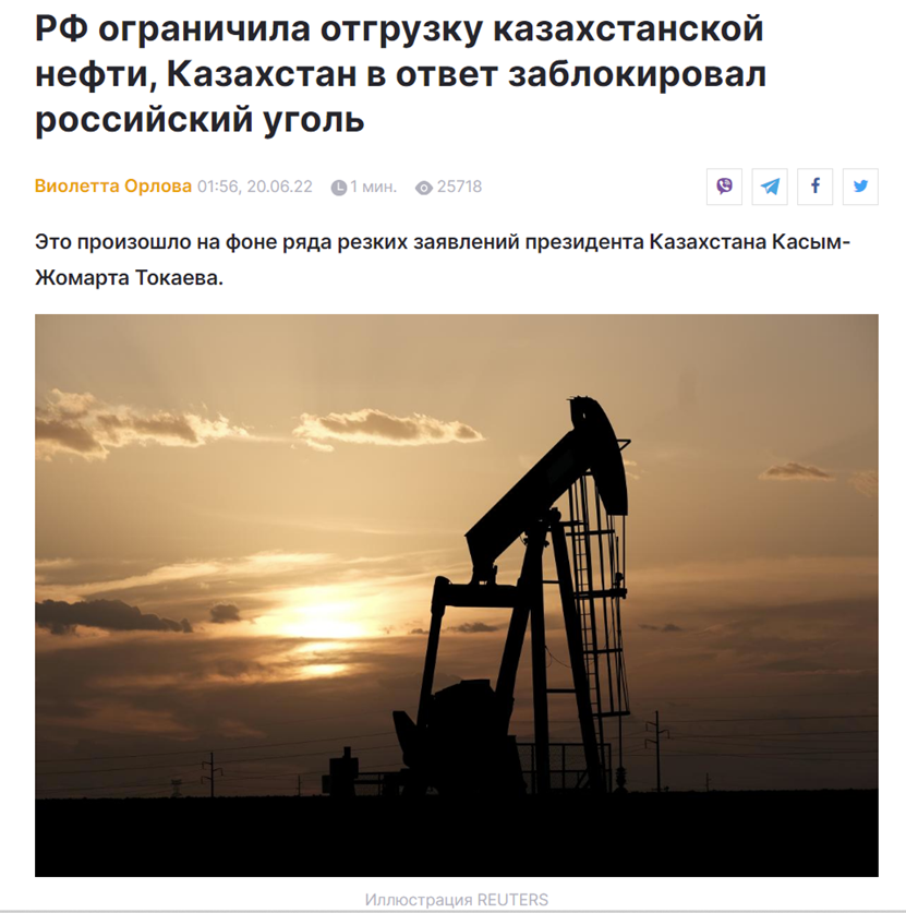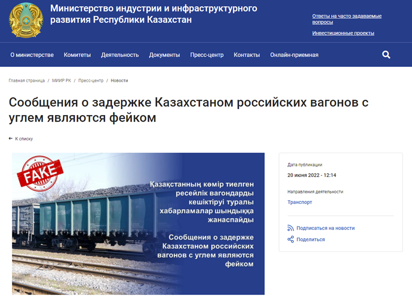 6月20日,哈萨克斯坦工业和基础设施发展部在官网公开声明,有关“哈萨克斯坦封锁了1700辆装载俄罗斯煤炭的货车”的消息是虚假信息——“事实上,在哈萨克斯坦境内不存在1700辆装有俄罗斯煤炭的车皮。在俄罗斯的铁轨上也没有从哈萨克斯坦出发、或朝哈萨克斯坦开来的装载煤炭的车皮。”