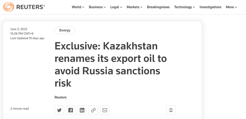 6月3日,路透社独家报道称,哈萨克斯坦石油生产商CNPC-Aktobemunaigaz在一份对路透社要求的书面答复中说,由于最近重大的地缘政治变化,并且为了避免这些变化对哈萨克斯坦通过俄罗斯港口出口石油产生负面影响,从2022年6月起,哈萨克斯坦将其出口石油的名字改作了KEBCO (哈萨克斯坦出口混合原油)。该新名称将其与原产于俄罗斯的石油进行了区分,以避免制裁风险和融资问题。