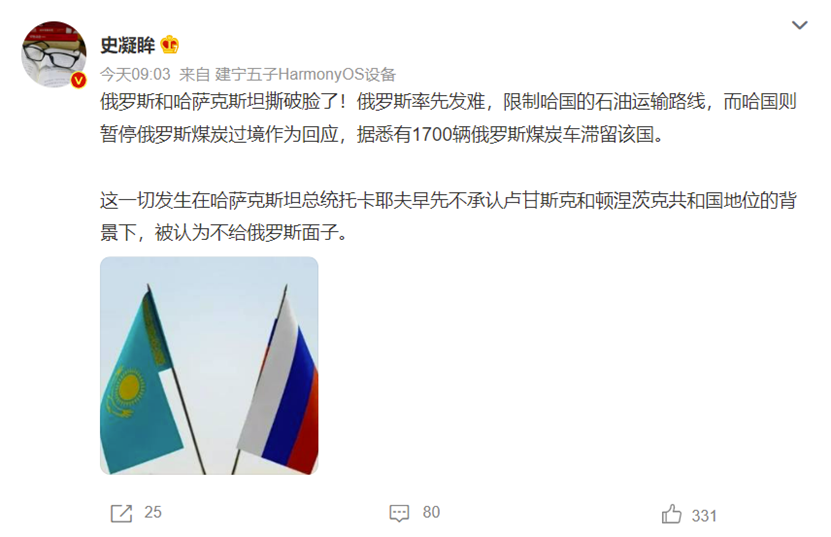 6月20日起,中文网络流传消息称,在哈萨克斯坦总统发表不承认乌东两个地区独立的言论后,俄哈两国撕破了脸皮——俄罗斯以排雷为由,限制了哈萨克斯坦的石油运输路线,而哈萨克斯坦则在其领土上封锁了1700辆载有俄罗斯煤炭的货车。