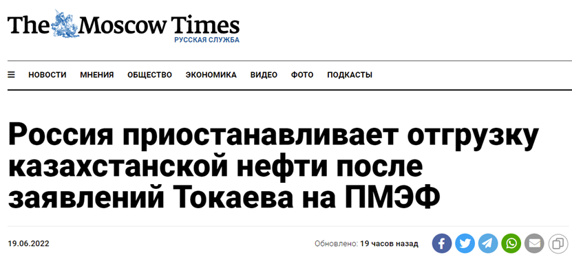 在谷歌上检索“哈萨克斯坦 俄罗斯 石油”等关键词,将搜索日期限制在6月17日后,可以找到《莫斯科时报》在19日发表的一篇文章,标题为《托卡耶夫在SPIEF会议上发言后,俄罗斯暂停了哈萨克斯坦石油的运输》。