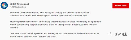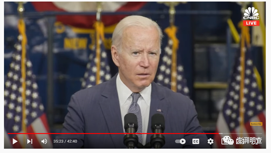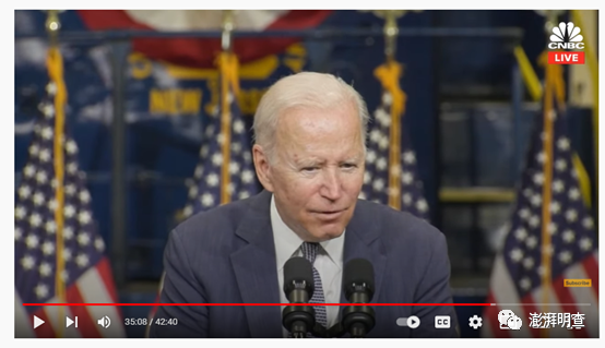 然而,拜登的发言并不像剪辑视频所说那样,是在就税收问题回答记者提问。CNBC发布的直播视频中全程未涉及媒体提问环节。且根据视频下方的介绍,拜登此次到新泽西是为了就当局想要推行的重建更好未来议程(Build Back Better Agenda)和两党基建协议发表演说。