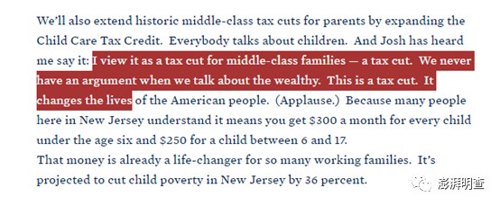 拜登先是放低声音表示“我将此视作为中产阶级家庭减税”,继而提高了音量强调“我们从未在谈论富人时起过争论。这是减税,这改变生活。”