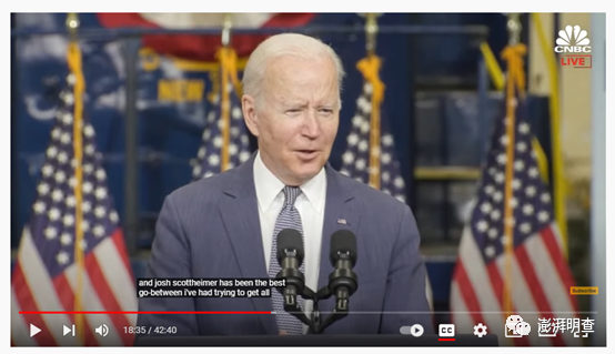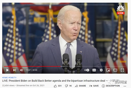 该视频由全美广播公司(NBC)旗下CNBC电视于2021年10月26日发布在其YouTube官方频道上,全长共计42分40秒,其中拜登的讲话始于第17分33秒,持续时长约20分钟。