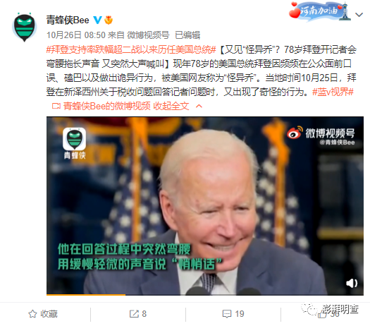 近日,微博、今日头条等社交平台上流传着一段视频,称当地时间10月25日,美国总统拜登在新泽西州就税收问题答记者问时,出现了怪异行为,一会儿弯腰拖长声音,一会儿又突然大声喊叫。