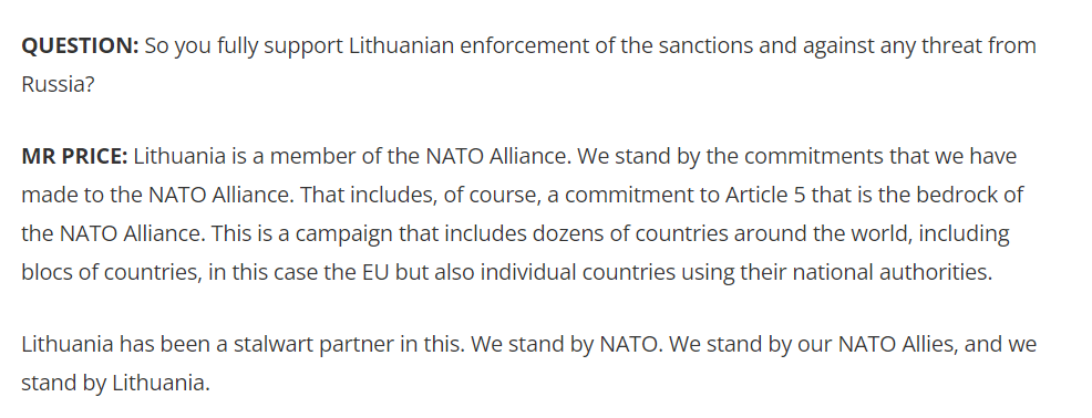 在当地时间6月21日的新闻发布会上,当被问及对立陶宛对加里宁格勒实施运输封锁这一决定的态度,美国国务院发言人内德·普莱斯力挺立陶宛称:“立陶宛是北约的成员国。我们坚持我们对北约所作出的承诺……立陶宛一直是这方面的坚定伙伴。我们支持北约。我们支持我们的北约盟国,我们支持立陶宛。”