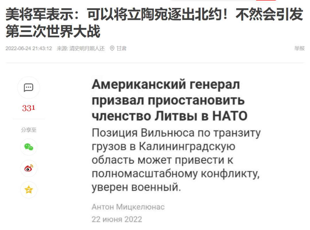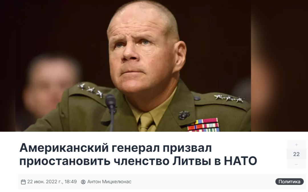 在谷歌中搜索俄语报道标题“美国呼吁终止立陶宛的北约成员国身份”(Американский генерал призвал приостановить членство Литвы в НАТО),可以找到原文由“安东·米克尔尤纳斯”6月22日发布在一家名为Panorama.pub的资讯网站。
