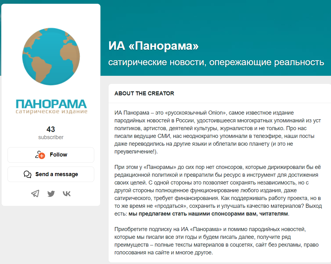 最初捏造这则消息的网站Panorama实为一家讽刺新闻网站。其标志就已经标明了其属性:Сатирическое издание(讽刺版)。尽管Panorama在其网站介绍中称自己成立于1822年,是“最古老的苏联和俄罗斯通讯社”,但该网站实际上则成立于2017年。6月26日,Panorama在众筹网站boosty上发布读者赞助渠道,并自称为“俄语版的洋葱新闻”“俄罗斯最著名的恶搞新闻”。