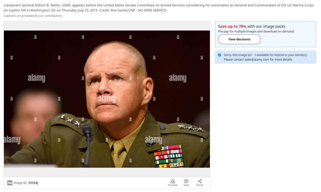 在BBC官网上搜索关键词“Robert Jefferson”,并未发现任何“美国准将”接受采访的消息。事实上,美军中也没有任何名为罗伯特·杰斐逊的“准将”。对Panorama使用的这张照片进行反搜,可知图中这位将军名为罗伯特·内勒(Robert Neller),2015年起担任美国海军陆战队第37任司令,2019年卸任并退役。根据Alamy图片库的描述,原图拍摄于2015年7月内勒出席美参议院军事委员会,被提名为海军陆战队司令现场。