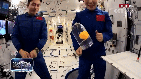 “乒乓球没有上浮”的现象从侧面证明王亚萍等人所在的空间处于失重状态。在做完该实验后,王亚平从桌面上拿起了水杯,对其施以推力,让水杯连同杯中的水和乒乓球一起,在空中翻腾了几圈,并最终被一旁的翟志刚接住,盖上了盖子。