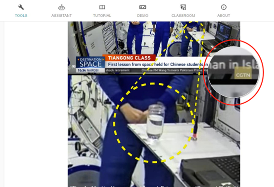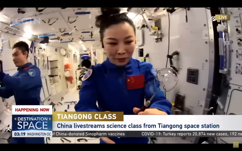因此,网传截图的画面,为CGTN于今年3月23日报道“天宫课堂”第二课时,在介绍宇航员们在太空为中国学生授课的过往历程时,所使用的2021年“天宫课堂”第一课的资料画面。