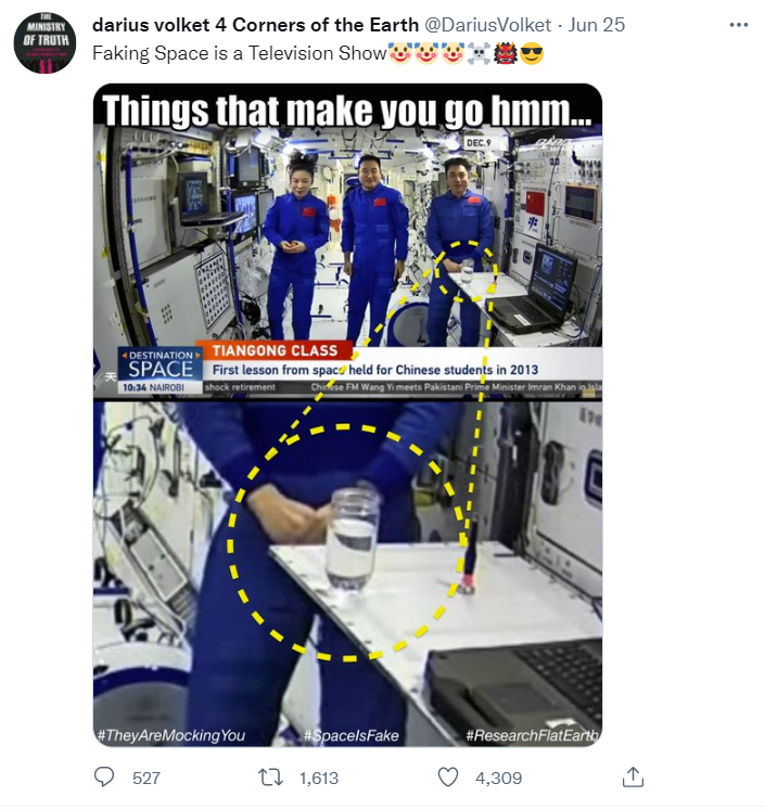 近日,一张在推特上流传的图片对中国航天员在太空为学生授课一事提出了质疑。图片中盛有清水并被放置在桌面上的水杯被圈出并放大,并配上了“那些让你hmm的事”的标签。