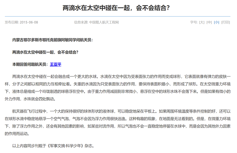 首先,失重水滴更易呈现球形的说法并没有错。在中国载人航天工程网官网“航天员问答记”栏目中,王亚平曾回答过来自内蒙古鄂尔多斯市鄂托克前旗的阿敏同学的提问。阿敏问:“两滴水在太空中碰在一起,会不会结合?”王亚平答:“两滴水在太空中碰在一起会融合成一个更大的水球。水滴在太空中因为受表面张力的作用而变成球形,它表面就像有弹力的皮肤一样,分子之间都以相同的力互相牵扯着。失重的水滴因为只受表面张力的作用,要保持表面积最小,而形成了球形。”