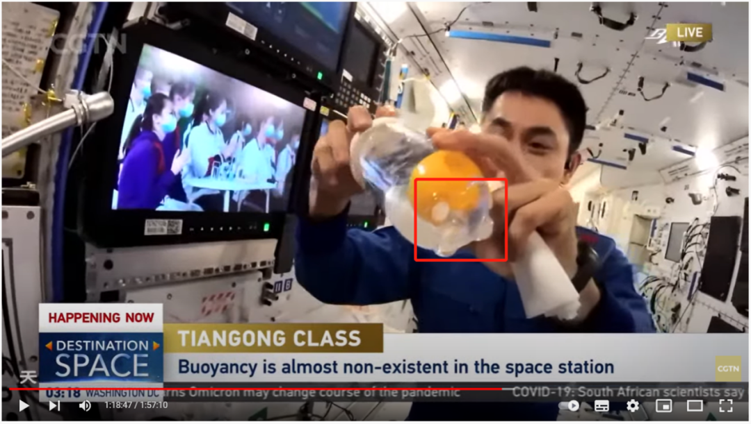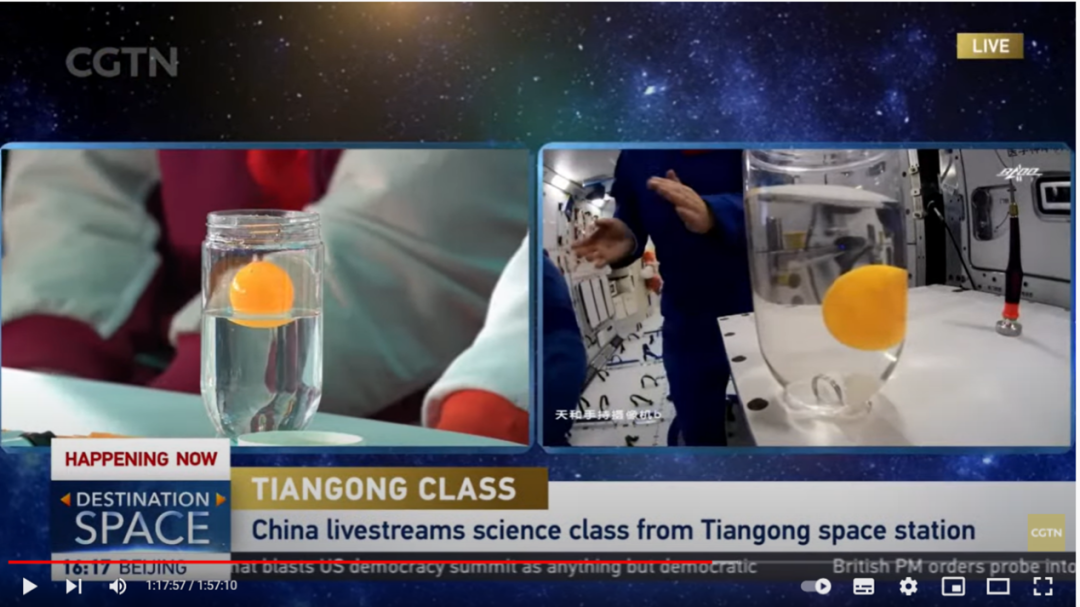 在CGTN直播视频的1小时17分34秒左右,王亚平从翟志刚手中接过了一个黄色乒乓球和一根吸管。只见她先将乒乓球小心地放入盛有水的杯子中,再轻轻用吸管一压,乒乓球停留在了水中,而没有似重力环境中常见的那般浮于水面上。