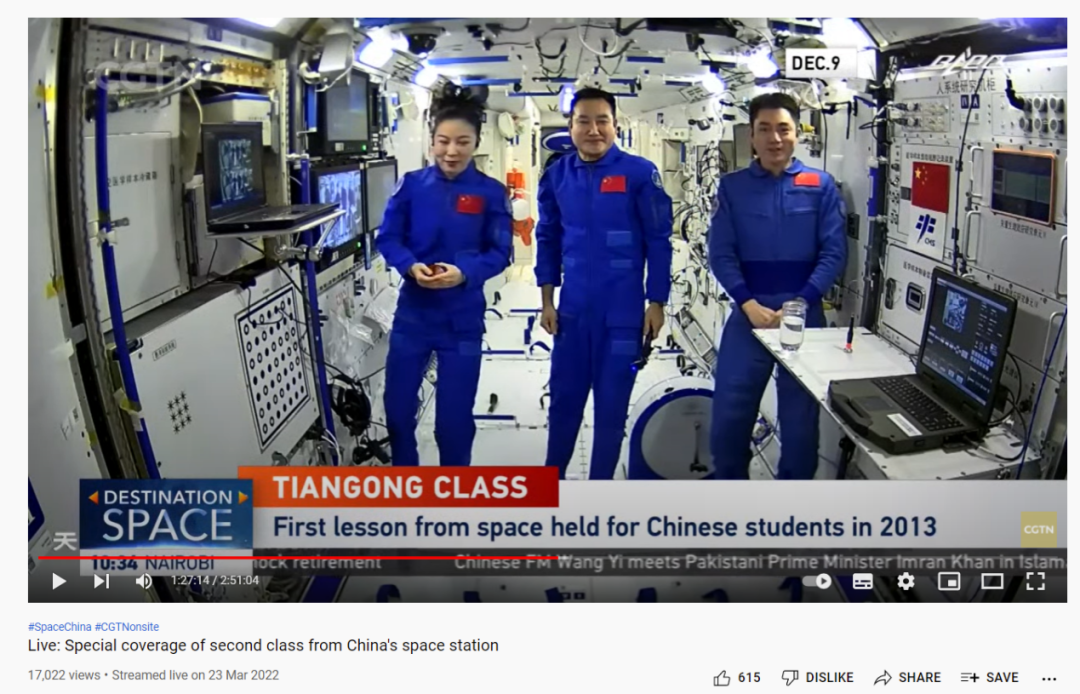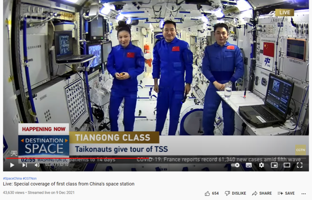 CGTN在2021年12月9日发布的《现场直播:来自中国空间站的第一堂课特别报道》视频中出现过相同的画面。