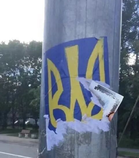 此外,除了这张蓝底的乌克兰三叉戟海报外,电线杆上还张贴有一张白底广告,虽然由于拍摄角度原因不能准确识别广告内容,但是可以确定广告上的文字为俄语。