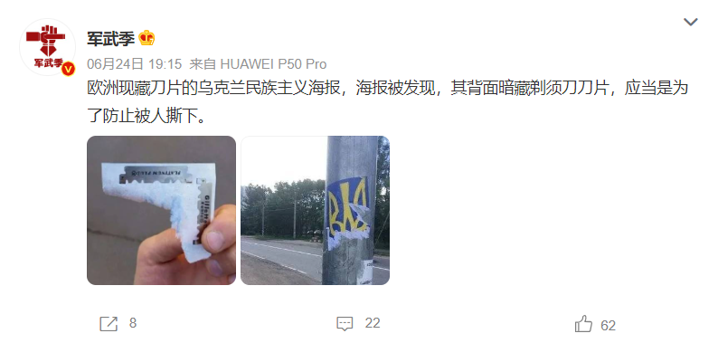 近日,有微博用户表示,欧洲出现乌克兰民族主义海报。海报背面暗藏剃须刀刀片,“应当是为了防止被人撕下。”