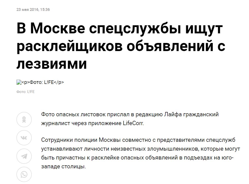 在Yandex图片搜索引擎中对图1进行反向搜索,结果显示原图至少在2016年5月就已经出现。俄罗斯媒体《生活》杂志于2016年5月23日的一篇文章中写道,这张背后带有刀片的“危险传单”照片是由一名“公民记者”发送至其编辑部的。这名“公民记者”还因此收获了一笔奖金。