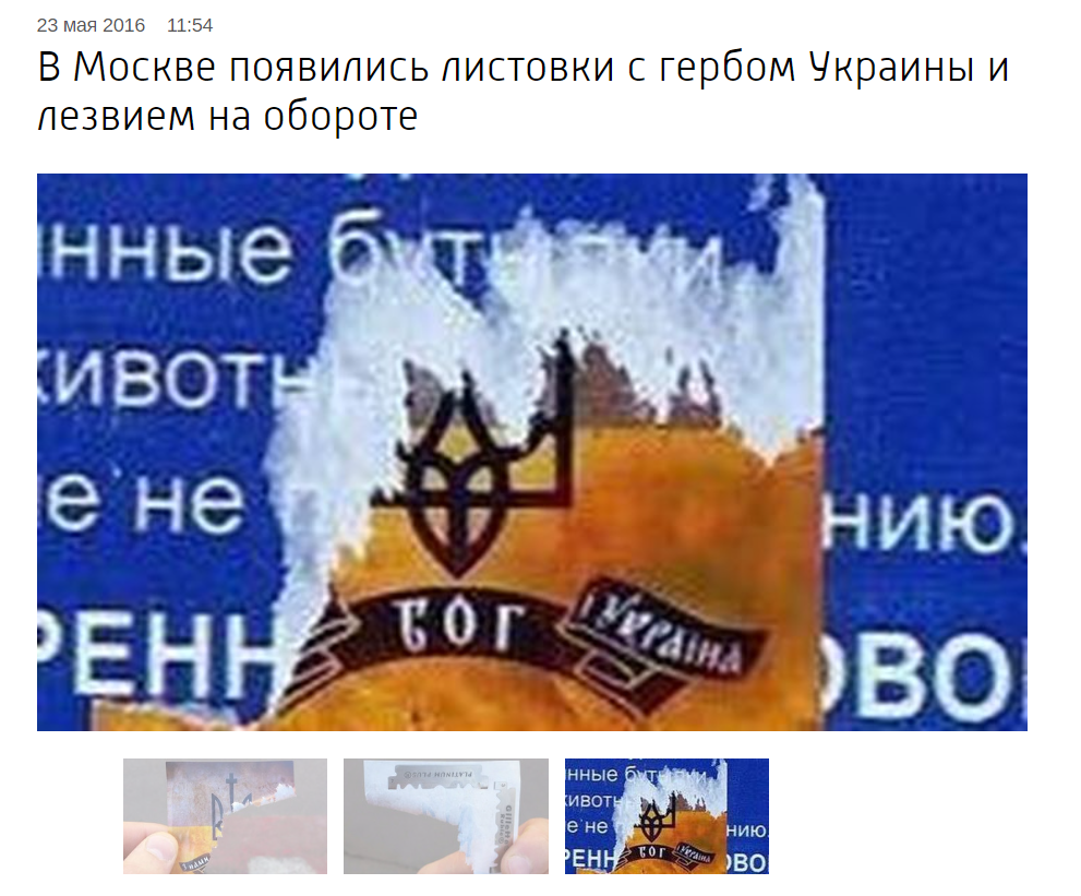 综上,“欧洲出现背面带有刀片的乌克兰国徽宣传海报”消息具有误导性。原图摄于莫斯科,发布于2016年5月,与当下俄乌冲突无关。据多家俄罗斯媒体2016年报道,莫斯科多个区出现类似的“危险传单”案件,莫斯科警方已经介入调查,但截至发稿时,未检索到公开的最新进展。