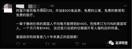 当地时间10月18日,有推特用户称,在美“阿富汗难民每月可以获得2125美元,外加300美元的食品券,以及免费的公寓、免费的教育和免费的医疗”,并将此同美国公民及退伍军人的待遇相比较。