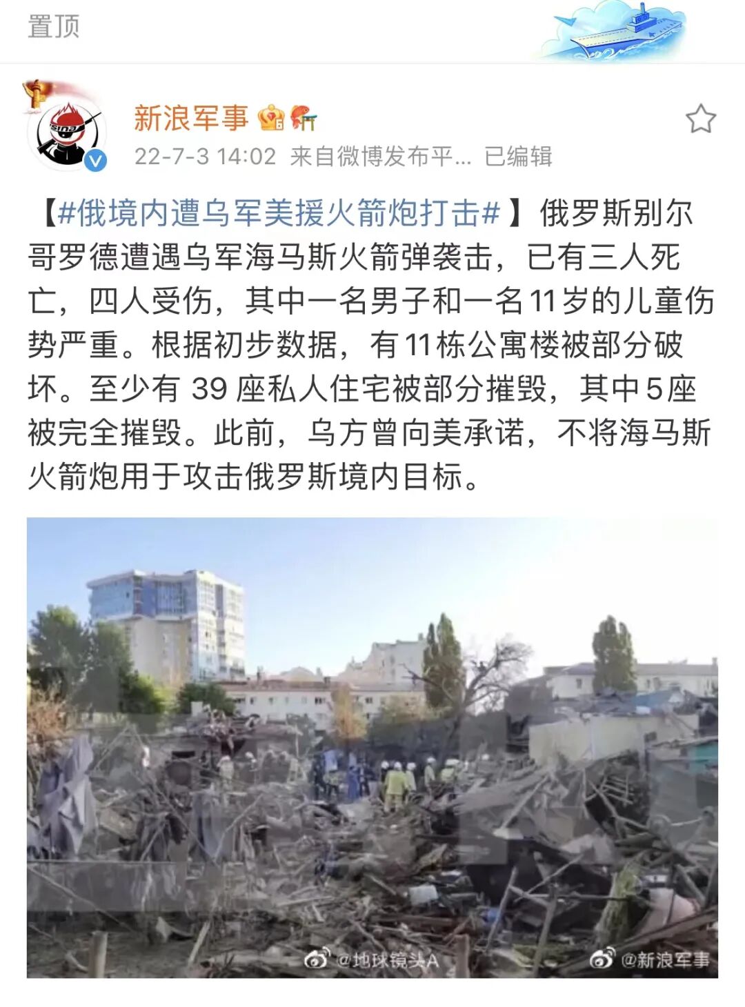 同一天,中文网络流传消息称:“俄罗斯别尔哥罗德遭遇乌军海马斯火箭弹袭击,已有三人死亡,四人受伤……此前,乌方曾向美承诺,不将海马斯火箭炮用于攻击俄罗斯境内目标。”该话题一度登上微博热搜,截至7月4日上午8时,阅读次数已超过8600万。