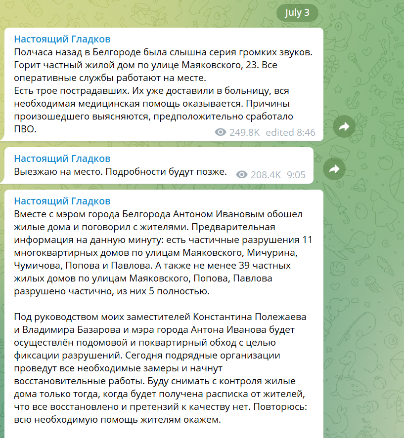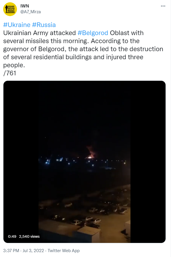 7月3日,有推特网友发布了一条58秒左右的视频,显示黑夜中有爆炸声和火光传出。相关消息称:“乌克兰军队今早用数枚导弹袭击了别尔哥罗德州。据别尔哥罗德州州长说,这次袭击导致几座居民楼被毁,有三人受伤。”