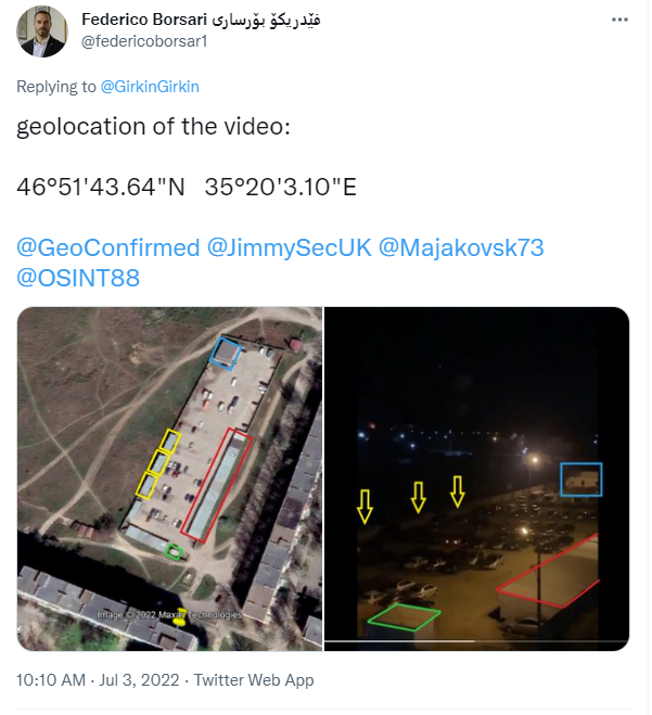 然而,对于该视频显示的导弹轰炸地点,不少推特用户指出,该视频拍摄于乌克兰扎波罗热州梅利托波尔市内的俄罗斯实际控制区域,而非俄罗斯本土。推特用户@federicoborsar1通过比对视频关键帧显示的建筑环境和卫星地图,确认了视频拍摄者的位置在东经35°20'3.10",北纬46°51'43.64"左右,属最早被俄军占领的城市之一——梅利托波尔市境内。