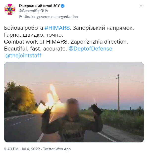 北京时间7月4日下午9时40分,乌克兰武装力量总参谋部在推特平台发布视频,宣布乌克兰扎波罗热州的武装部队开始使用美国“海马斯”多管火箭炮系统。此前据《卫报》等媒体报道,美国拜登政府在6月1日前后确认了将向基辅运输更多先进的火箭系统的消息,乌克兰则向华盛顿承诺,它不会使用美国提供的先进火箭系统来打击俄罗斯境内的目标。6月23日,乌克兰防长列兹尼科夫曾在推特上发文,宣布美国“海马斯”高机动火箭炮系统已运抵乌克兰。