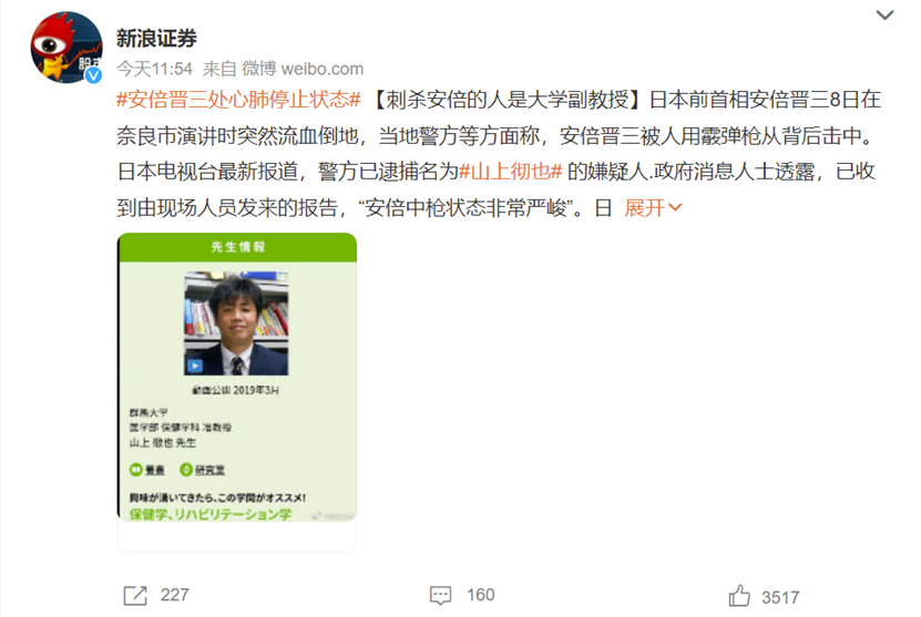 部分网友称此次刺杀案被捕的嫌疑人是大学副教授,随文附上的截图显示其身份为日本群马大学医学部保健学科的副教授山上徹也。