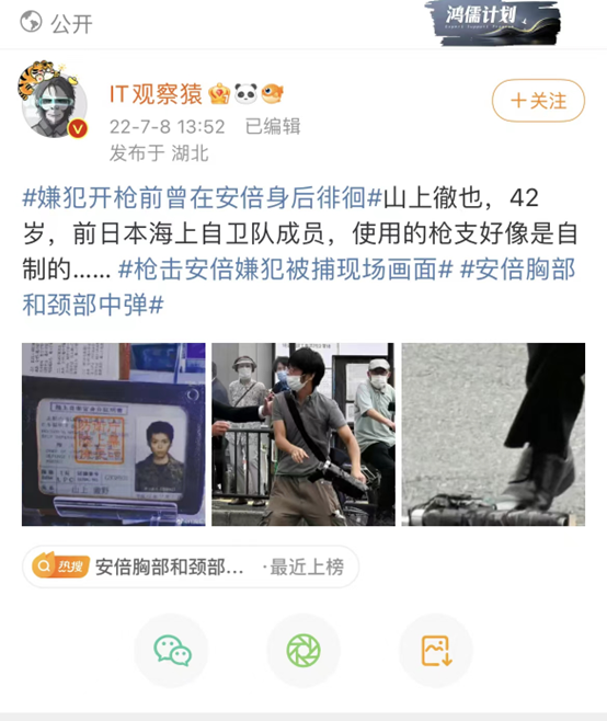 当地时间7月8日上午11点半(北京时间8日10点半),日本前首相安倍晋三在奈良市演讲时突然倒下,有消息称当场传出枪声,并且现场有血迹。随后,奈良当地警方称,嫌疑人已被逮捕。被捕的男子名为“山上徹也”(一说“山上彻也”),41岁,来自奈良市,无业,曾于2002年至2005年间担任日本海上自卫队成员。