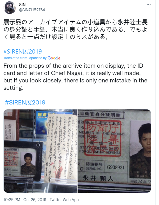 对相关证件图进行反搜,可以发现类似的证件图片在三年前经在网上出现。推特用户@SIN71152764曾于2019年10月26日发文,展示其参观“SIREN展2019”活动时看到的陈列品,其中就包括一张与网传图片显示相似的证件。该证件中人物的“阶级”“序列号”与网传图片内容无异,但姓名栏显示的却是另一个名字——“永井赖人”。
