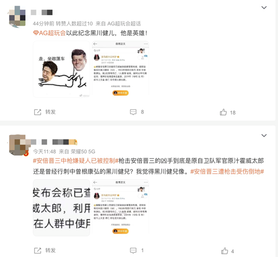 枪击发生后不久,有微博网友声称,刺杀安倍的凶手名为“黑川健儿”,58岁,1983年曾行刺日本前首相中曾根康弘,致2名警卫死亡、1人重伤被捕,被判50年有期徒刑,令和元年(2019年)大赦出狱。澎湃新闻此前报道,中曾根康弘,1982-1987年任日本首相,1984年在位期间曾访问中国。他是二战后首位参拜靖国神社的日本首相。2019年,中曾根因衰老原因自然死亡,享年101岁。