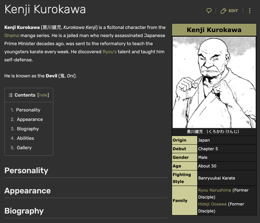 然而,“黑川健儿”(Kenji Kurokawa)并非真实存在人物,而是著名日本漫画《军鸡》中的虚构人物。《军鸡》漫画于1998年开始连载,2007年停更后于2011年回归,2015年正式完结,讲述了高中生成岛亮在杀死父母之后成为一名冷血武者的故事。黑川健儿就是在“感化院”中教授主人公成岛亮功夫的启蒙老师。黑川健儿曾经是“空手道组织万龙会”的成员,由于数十年前试图刺杀首相被判处无期徒刑,在囚禁期间开始担任青少年空手道老师。随着故事的发展,黑川健儿提前出狱,并继续教授成岛凉空手道。