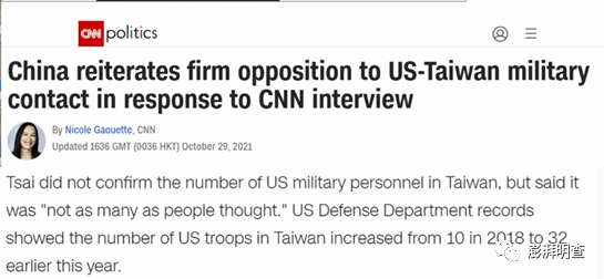 据《环球时报》10月29日报道:台当局领导人蔡英文近日首次证实美军存在于台湾,但没有透露人数。美国有线电视新闻网(CNN)当地时间10月28日披露,美军在台人数从2018年的10人增加至今年的32人.