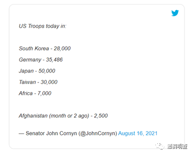 早在今年8月间,美国国会参议院共和党资深参议员约翰·科尼(John Cornyn)就曾在推特上公布所谓的美军在外驻扎的兵力,其中显示美军在台部署了多达3万人。