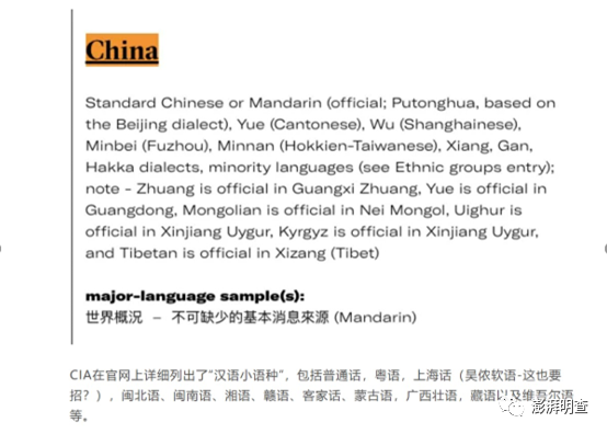 文章提及,“CIA在官网上详细列出了‘汉语小语种’,包括普通话,粤语,吴语(上海话),闽北语、闽南语、湘语、赣语、客家话”,同时还有少数民族语言,如蒙古语,广西壮语,藏语以及维吾尔语等,并辅以截图佐证。