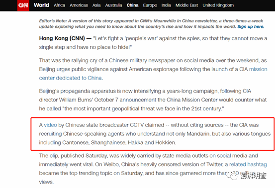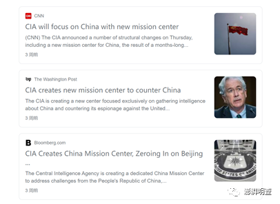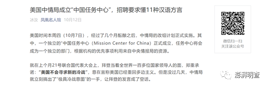 类似的消息也在微信平台上传播。10月中旬,一篇名为《美国中情局成立“中国任务中心”,招聘要求懂11种汉语方言》的公众号文章写到:“中情局的改组计划正式实施,其中,一个独立的‘中国任务中心(Mission Center for China)’正式成立。”