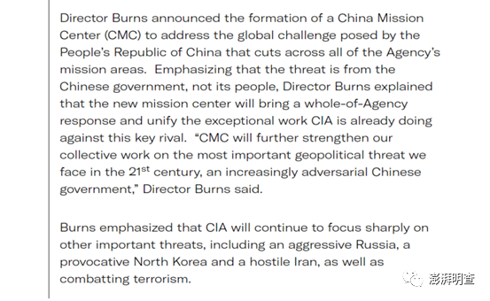 这篇报道宣称,中国带来的全球挑战已经渗入CIA的各个工作领域,为解决这一问题,CIA局长伯恩斯宣布将成立中国任务中心(CMC)。新的任务中心将会举全局之力,并结合CIA已在进行的杰出工作,来应对(中国)这一关键对手。