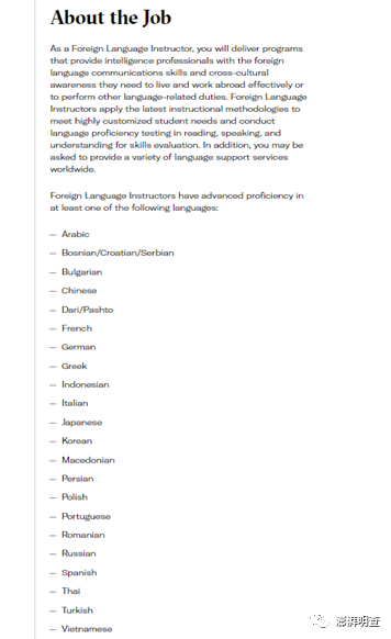 CIA的官网明确提供了当局公开招募的所有职位的信息。经核查,在153项招募职位中,只有5项职位与语言(language)直接相关,包括外语教师(Foreign Language Instructor),行动处语言官(Directorate of Operations Language Officer),手语翻译(Sign Language Interpreter)和其余两项学生学习项目。