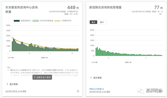 以东京都为例,官方数据显示,自9月以来,发热咨询中心咨询数量和新冠肺炎咨询热线受理量都明显走低。从9月1日(926件)到10月31日(77件),新冠肺炎咨询热线受理量下降了91.7%。