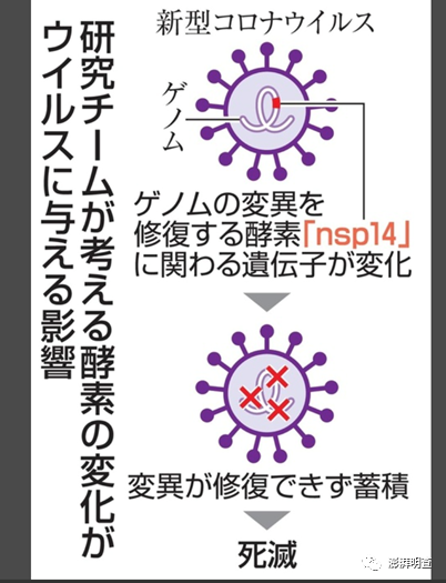 据日本共同通信社报道,10月30日,日本国立遗传研究所和新潟大学发表联合研究,认为日本疫情的平息可能与新冠病毒德尔塔毒株内一种名为“nsp14”的酶发生变化有关。这种酶可以对病毒进行修复,使病毒不断增殖。随着nsp14酶作用的降低,新冠病毒来不及“修复变异”,导致自行消解。