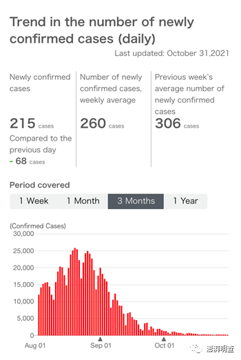 根据日本厚生劳动省数据,10月7日起,日本每日新增确诊病例数跌至1000以下。10月31日, 日本全境共确诊215人,47个都府县中有14个新增病例清零。在东京,11月1日的新增确诊病例仅9例。