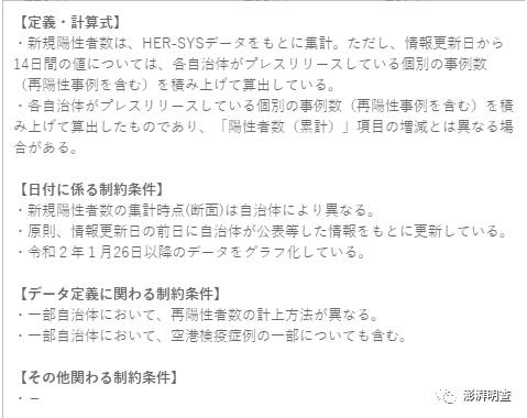 厚生劳动省在其公布的单日新增确诊人数图表下方附上了对数据来源和统计方式的说明。该说明显示,日本新增确诊人数根据HER-SYS系统数据计算。但是,自信息更新之日起至14天内的数值则是通过累计各地方政府发布的病例数(包括复阳病例)计算得出的。