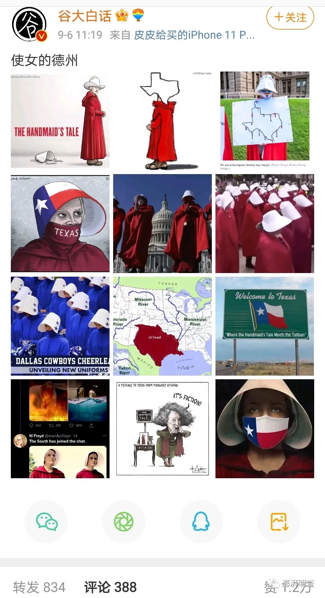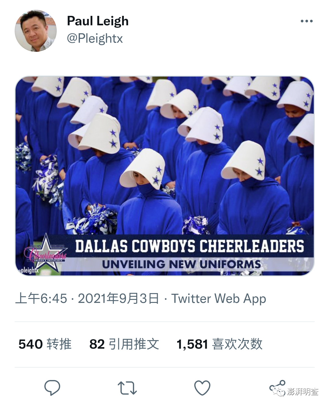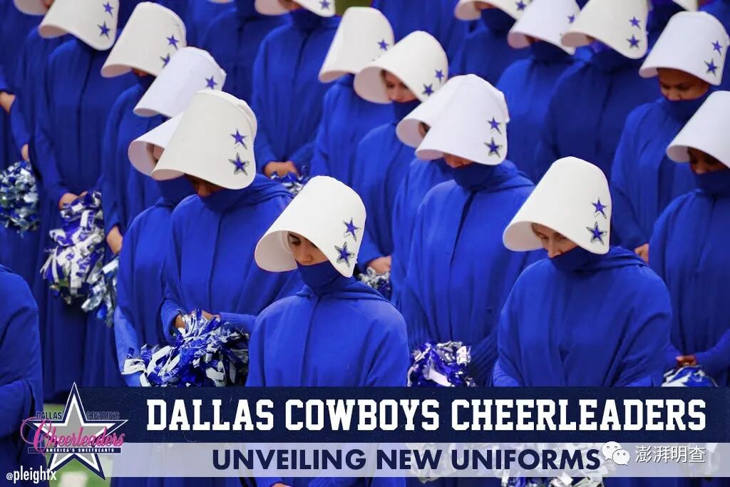 当地时间9月2日,一张“达拉斯牛仔啦啦队新队服”的照片在推特上广为流传(编者注:达拉斯牛仔是得克萨斯州达拉斯市的美式橄榄球队),图片上的“啦啦队队员”身着美剧《使女的故事》中的长袍和翼帽,“以此抗议反堕胎法的生效”。9月6日,一名微博大V用户同样引用了该图片,并配文“使女的德州”(编者注:指得州)。