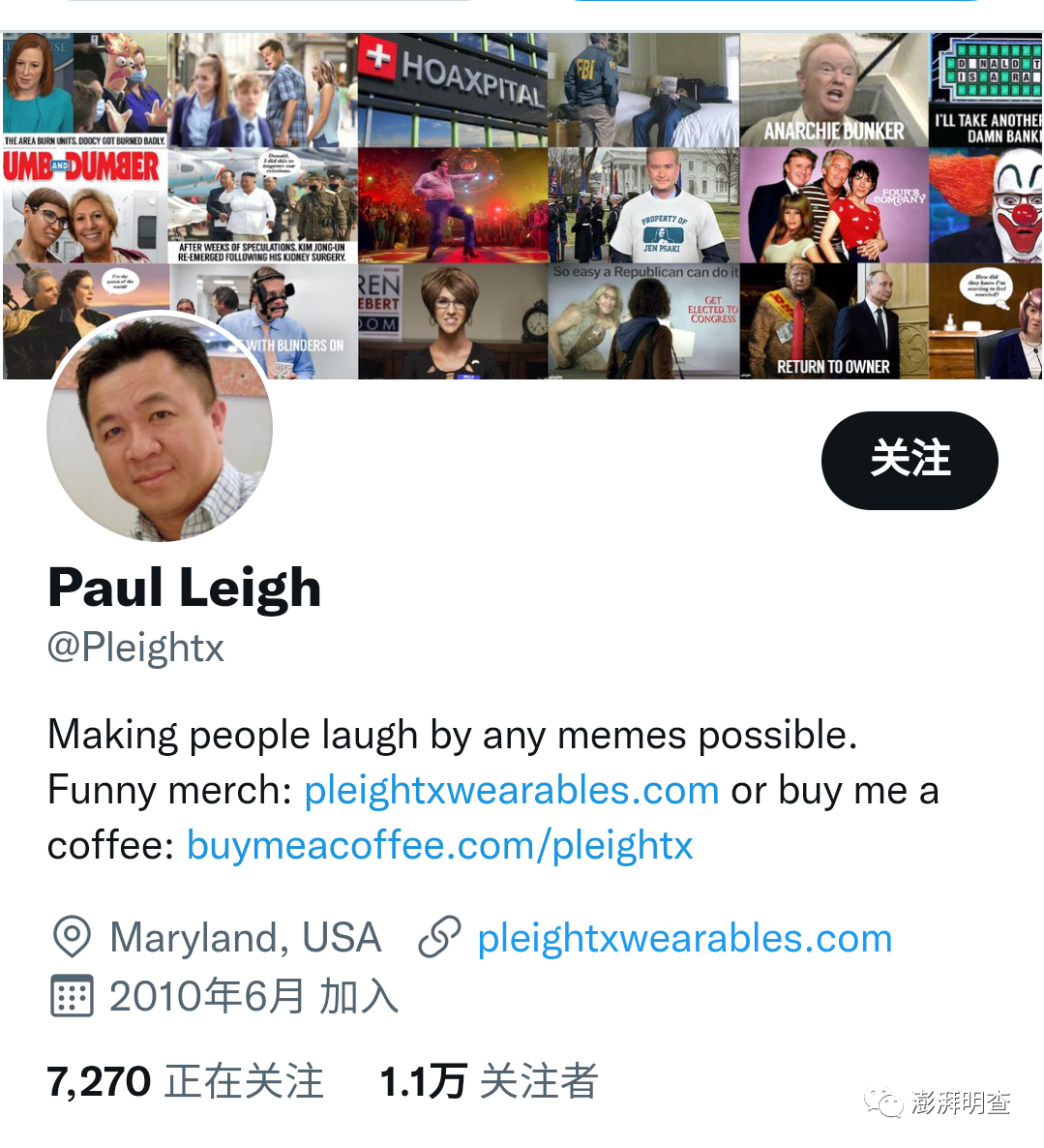 由原图右下角的水印可以发现,图片最早是一名叫做“Paul Leigh”的推特用户发布的,其个人简介显示,他是一名“梗图”创作者。