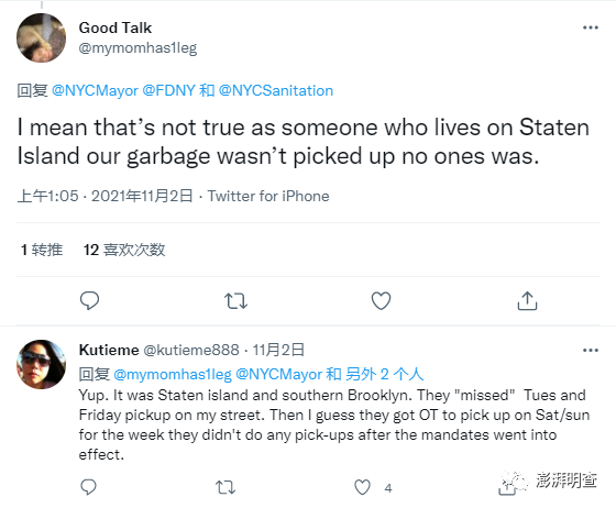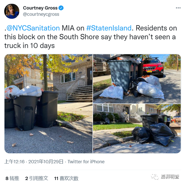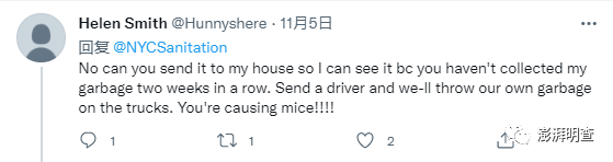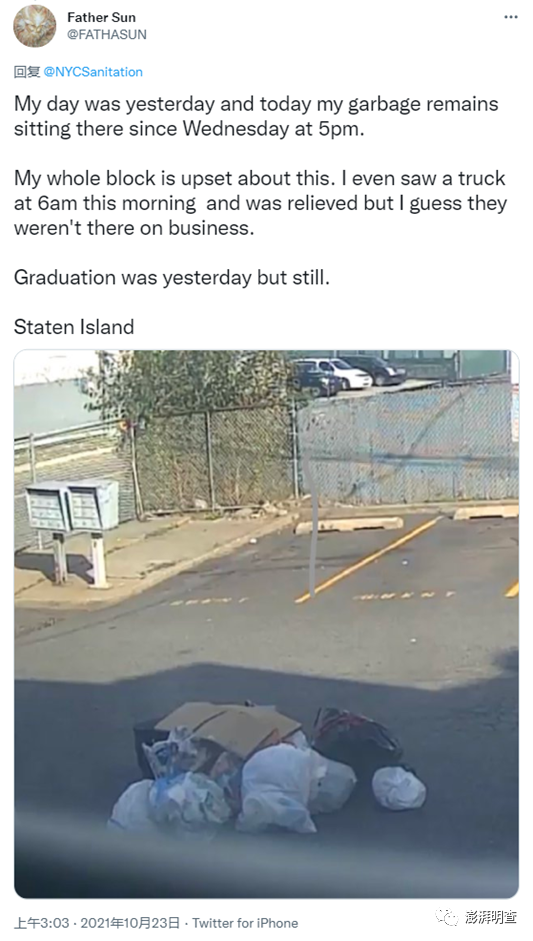 从10月23日起,就有用户陆续在纽约卫生部门的官方推特(@NYCSanitation)下反映有关垃圾清理延迟的问题。