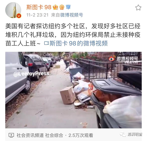 日前,有微博认证用户称,美国有记者探访多个纽约社区,发现好多社区的垃圾已经堆积几个礼拜,因为纽约环保局禁止未接种疫苗工人上班。这个2分钟的视频由多个连续镜头画面剪辑拼接而成。视频中的街道上行人寥寥,街边堆积有大量纸箱和塑料垃圾袋。