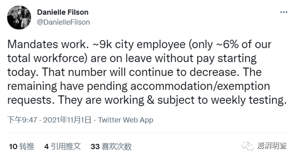 白思豪新闻秘书丹尼埃尔·费尔森(Danielle Filson)11月1日表示,受到该疫苗令的限制,约9000名市政工作人员将进行无薪休假。