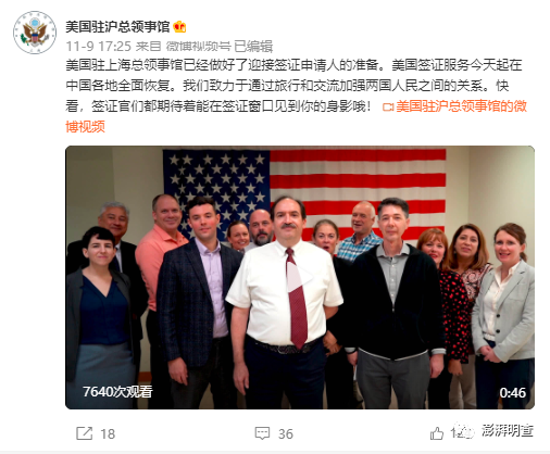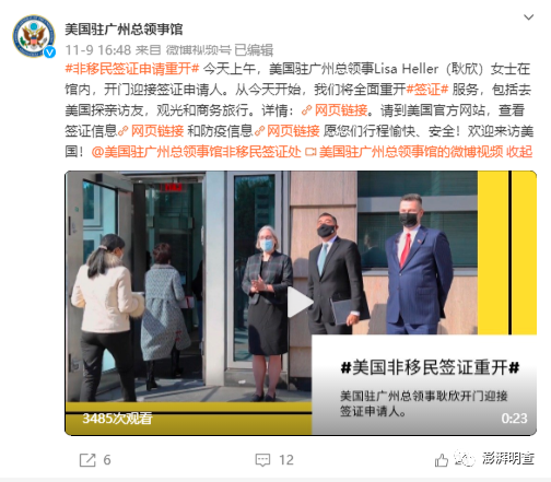 11月9日,美国《侨报》发布文章称,美驻华使馆恢复非移民签证面谈首日,等候大厅的人数众多,B-2类签证的旅游探亲签出签速度极快。一对计划到休斯敦看望子女的老夫妻仅等待了2分钟,就拿到了签证,且表示:“我们前面很多旅游的人和我们一样都顺利通过了。”