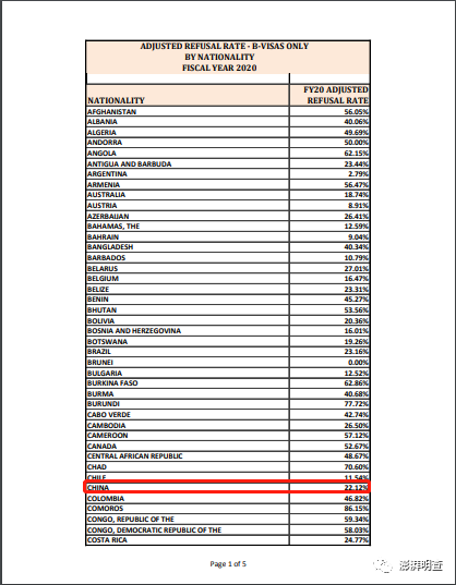 官网上一份发布于2021年2月12日的文件显示,在2020财年(2019年10月1日到2020年9月30日),美国对中国非移民B类签证(包括B-1类和B-2类)的调整后拒签率为22.12%,该数据排除了重复申请人数及其申请结果对计算的干扰。